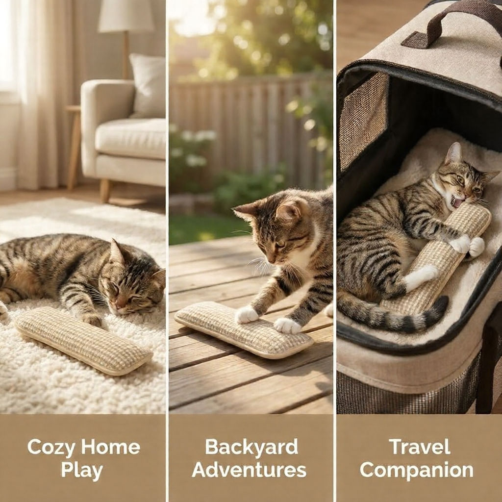 "My elderly cat Annie has arthritis and doesn't play much anymore, but she loves scratching and sleeping with this. It's gentle on her but still satisfies her instincts. I'm so relieved to see her engaged again without worrying about her hurting herself. No chemical smell when I opened it—just smells like herbs."